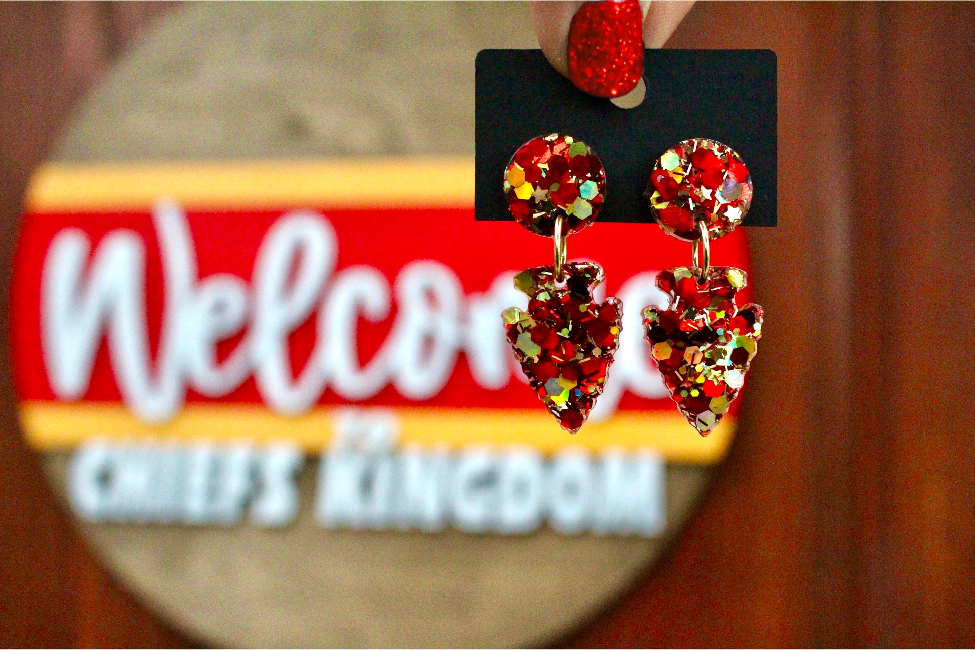 Made for Red Friday (and every game day in between), these earrings bring the sparkle. ✨ A round resin stud packed with chunky red + gold glitter sets the stage, while a glittering resin arrowhead dangles below for extra movement and team spirit. Lightweight, bold, and full of KC pride — they’re the ultimate accessory for cheering on the Chiefs in style. ❤️💛