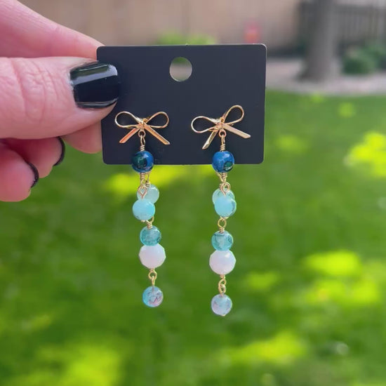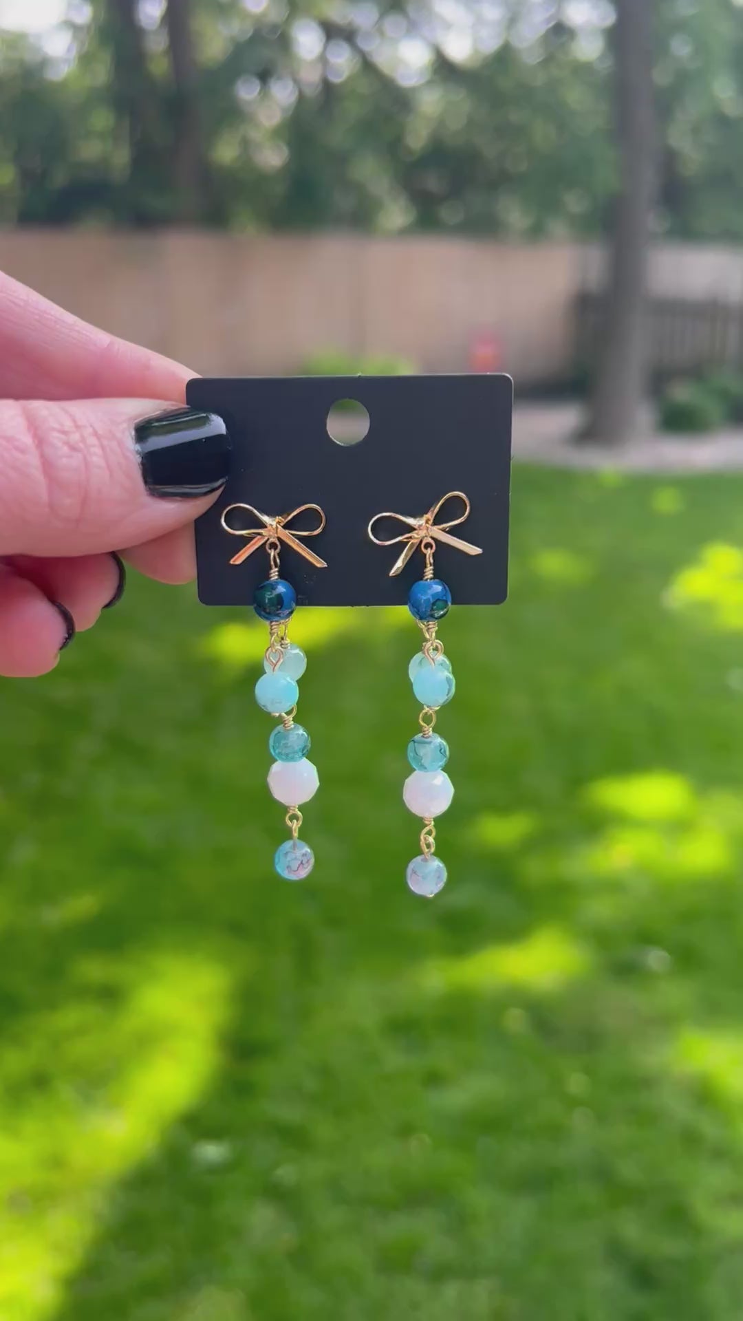 Gold bow studs meet dangling beads in cool blueberry hues — these earrings bring just the right amount of playful sparkle to match your Blueberry Fuego necklace. They’re the perfect little detail to brighten your day and complete the set.
