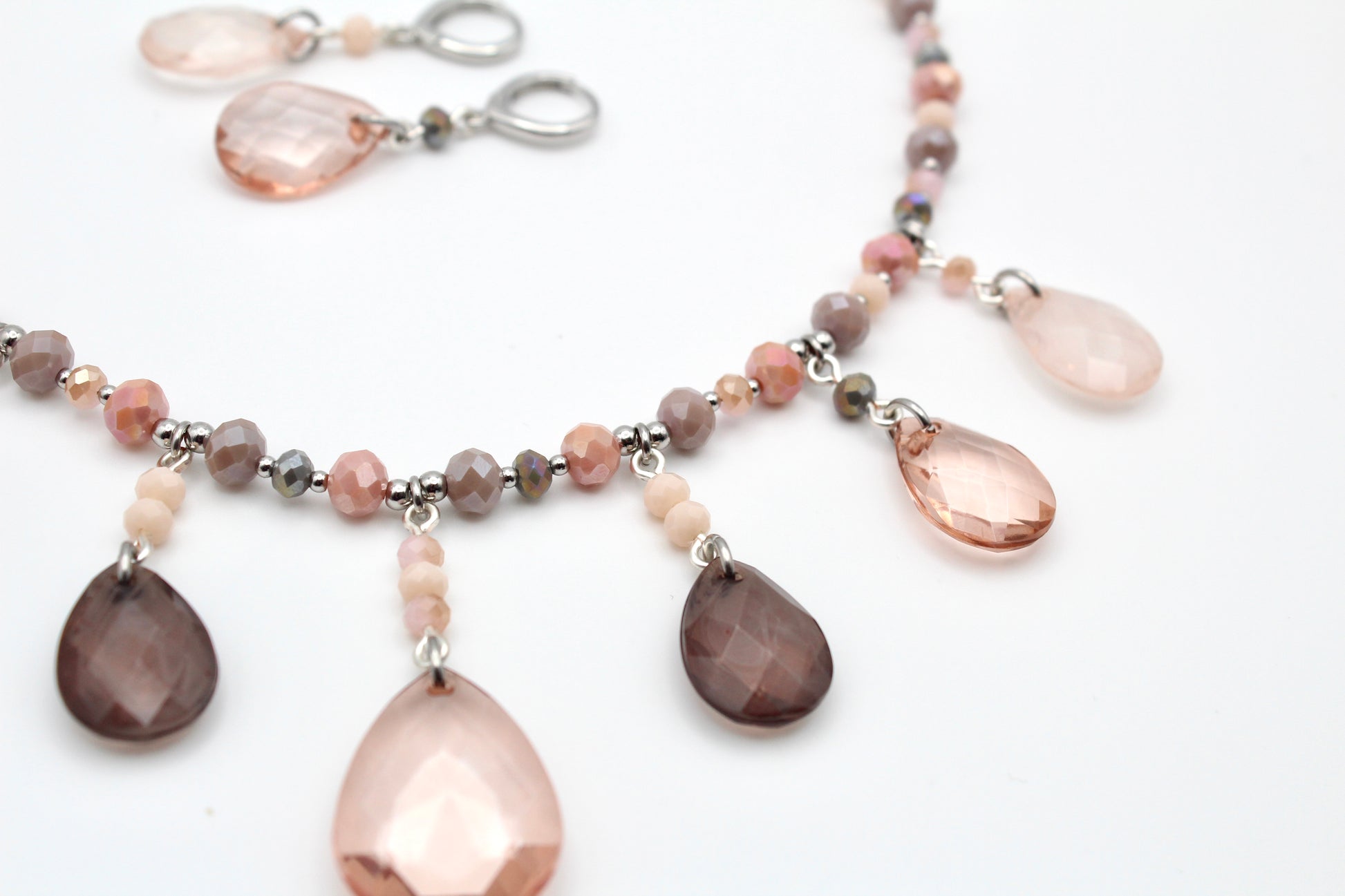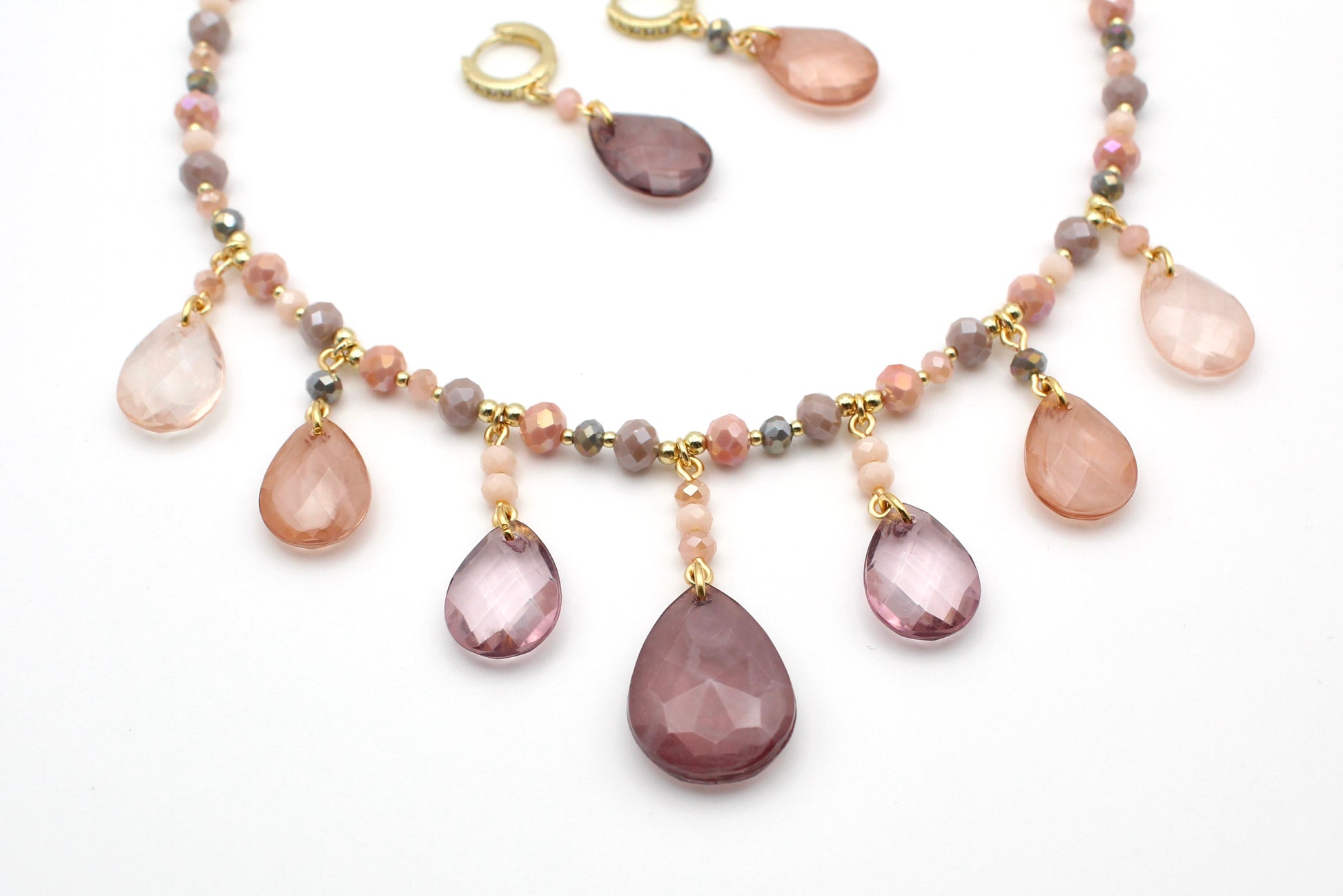Another ACOTAR reference because this necklace instantly reminded me of a certain Spring Court wedding (IYKYK). Soft mauvey shades of crystal beads create a dreamy, romantic palette while teardrop crystal dangles add movement and sparkle. The center features a large teardrop charm, flanked by four smaller teardrop dangles that give the necklace its whimsical, statement feel. The teardrop crystals were sourced from a thrifted necklace that was carefully deconstructed, giving these beautiful beads a second life.