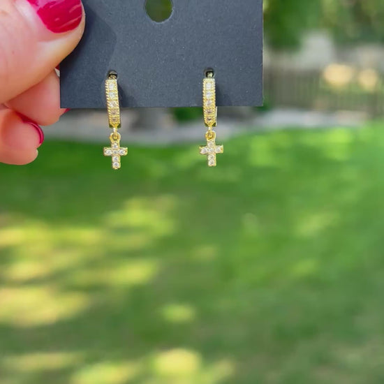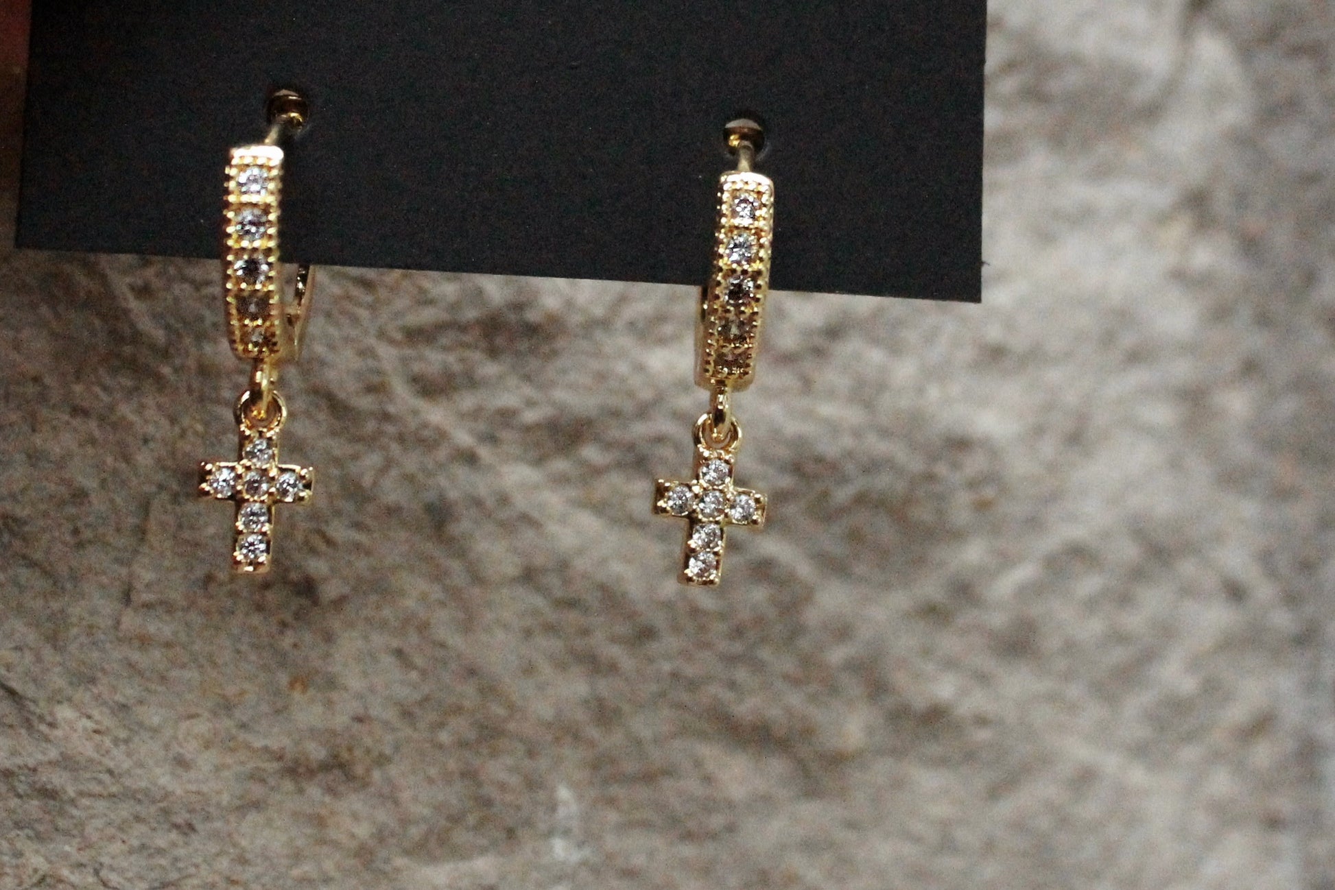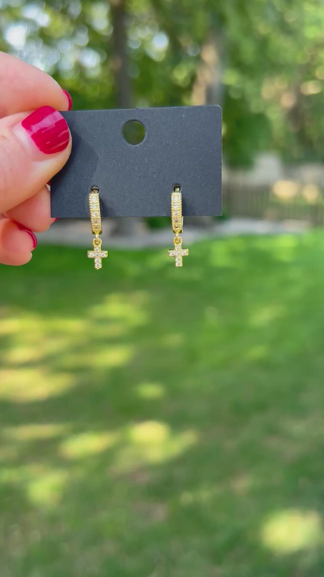 Heavenly sparkle, meet everyday wear. These huggie hoops are lined with sparkly crystals and finished with a tiny dangling crystal-studded cross. They’re dainty, elegant, and catch the light like a prayer answered.