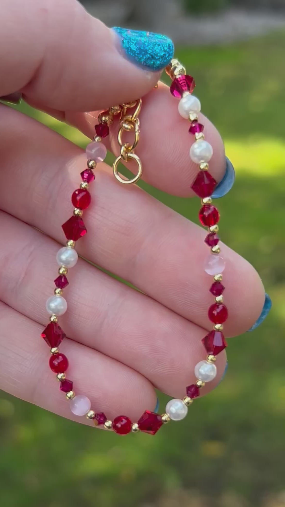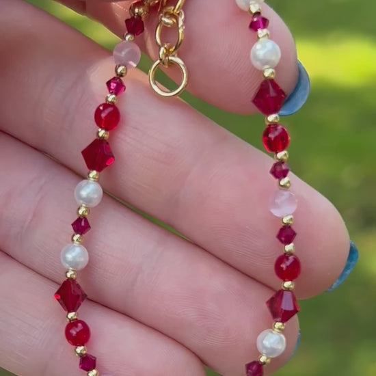 Deep red stones with soft pink accents and pearls create a bracelet that’s romantic, sparkly, and wearable every day. 6.5” with a 0.5” extender layers easily with your other pieces—great for July birthdays or anyone who loves pinky-red tones.