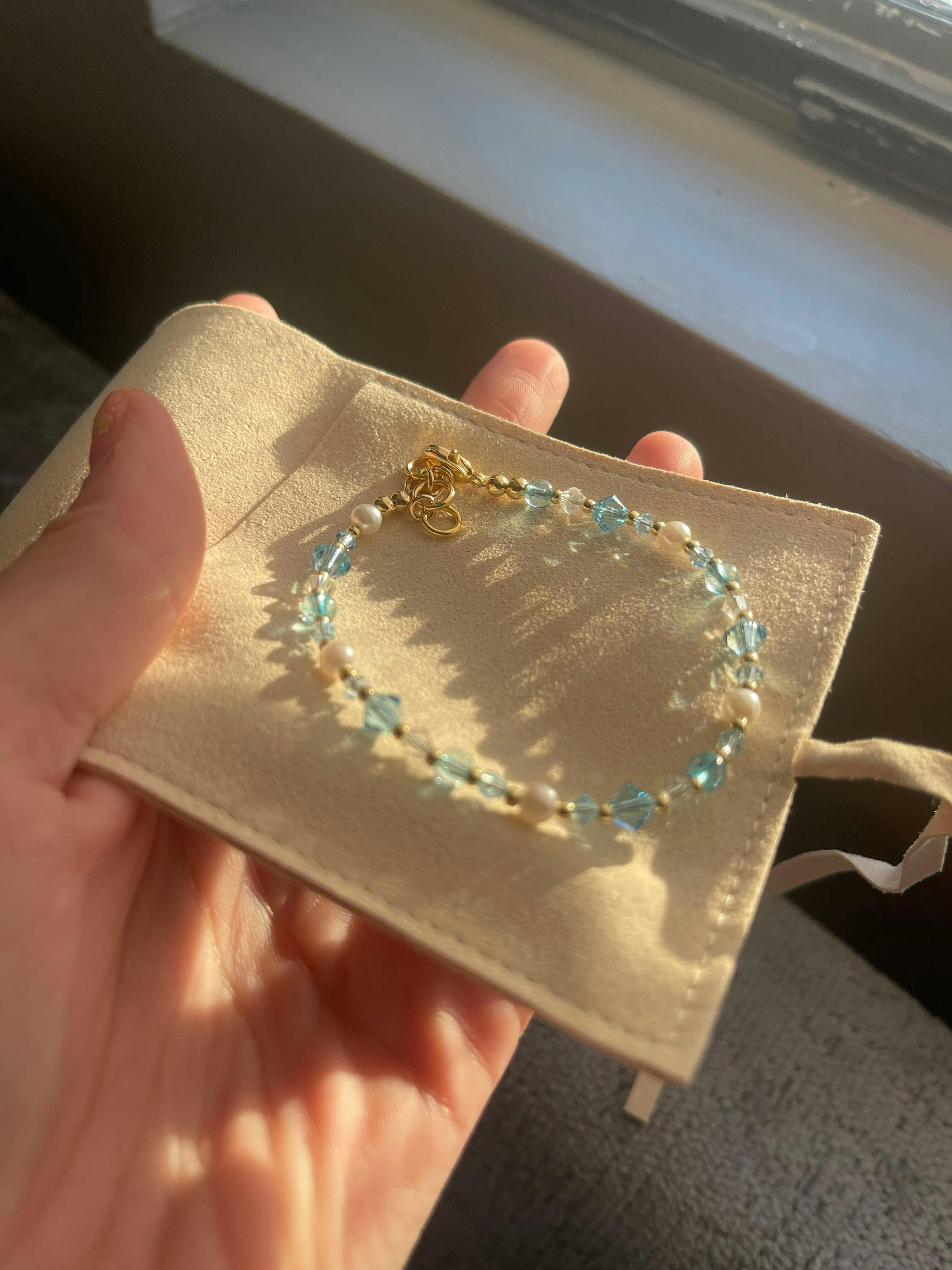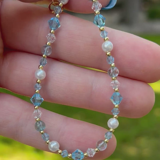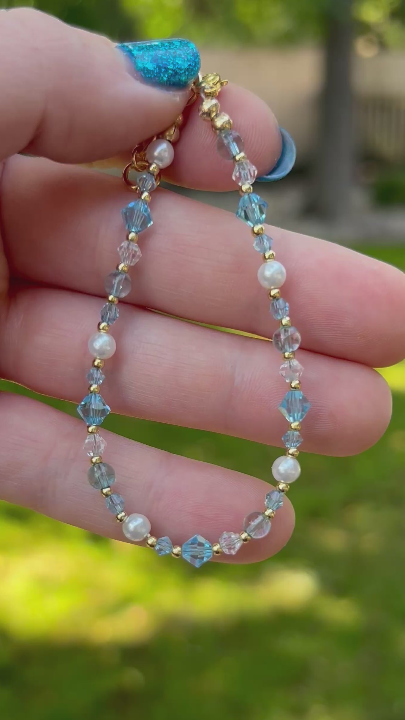 Pale aquamarine stones, clear crystals, and pearls come together in a soft, light bracelet that’s easy to wear every day. 6.5” with a 0.5” extender sits just right on your wrist and stacks effortlessly.