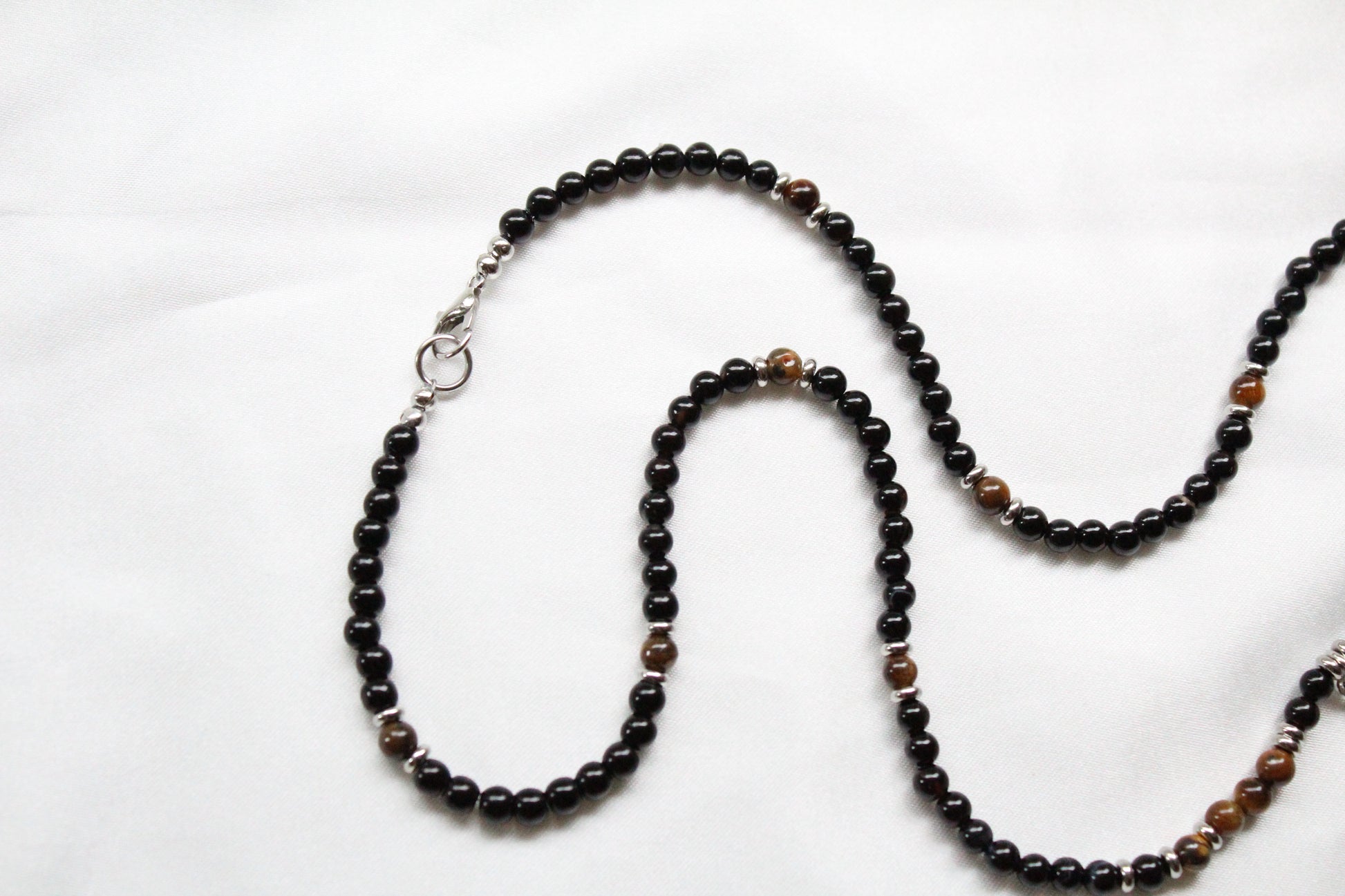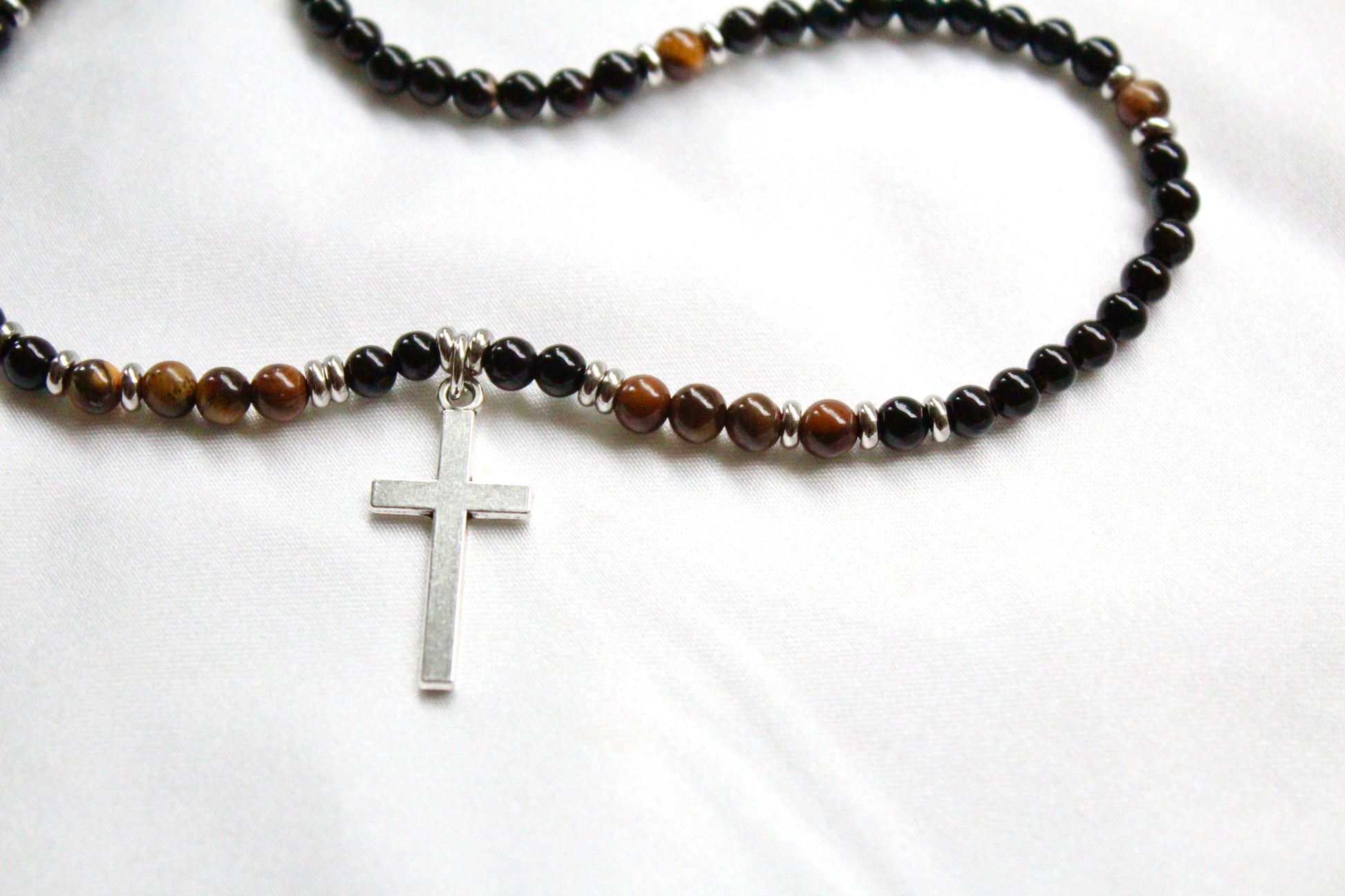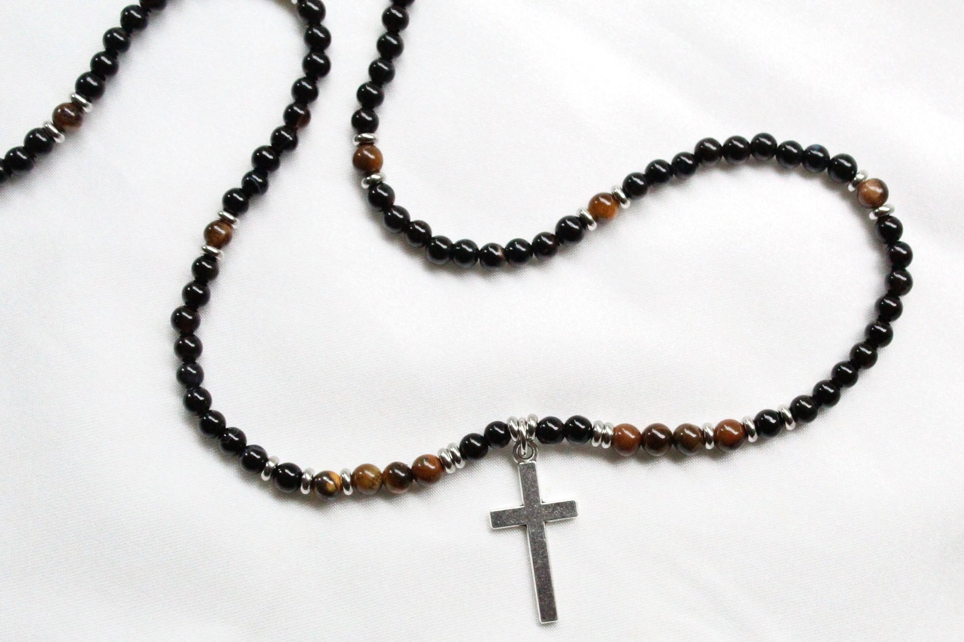 The Crossroads Necklace pairs smooth black and warm brown 4mm beads with glints of silver rondelle spacers, finished off with a sleek stainless steel cross pendant. At 20” long, it sits comfortably at the collarbone—perfect for solo styling or clean layering.