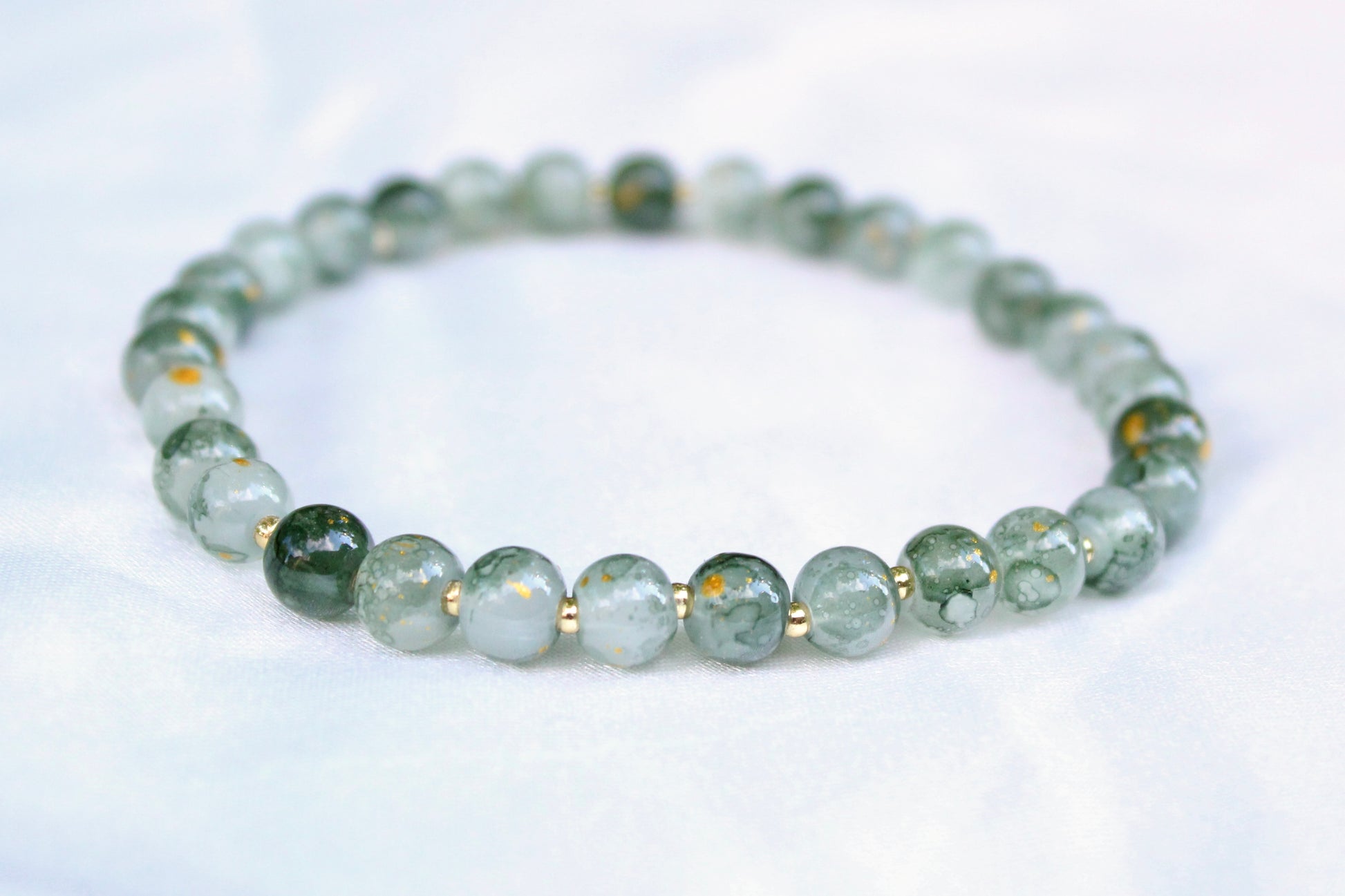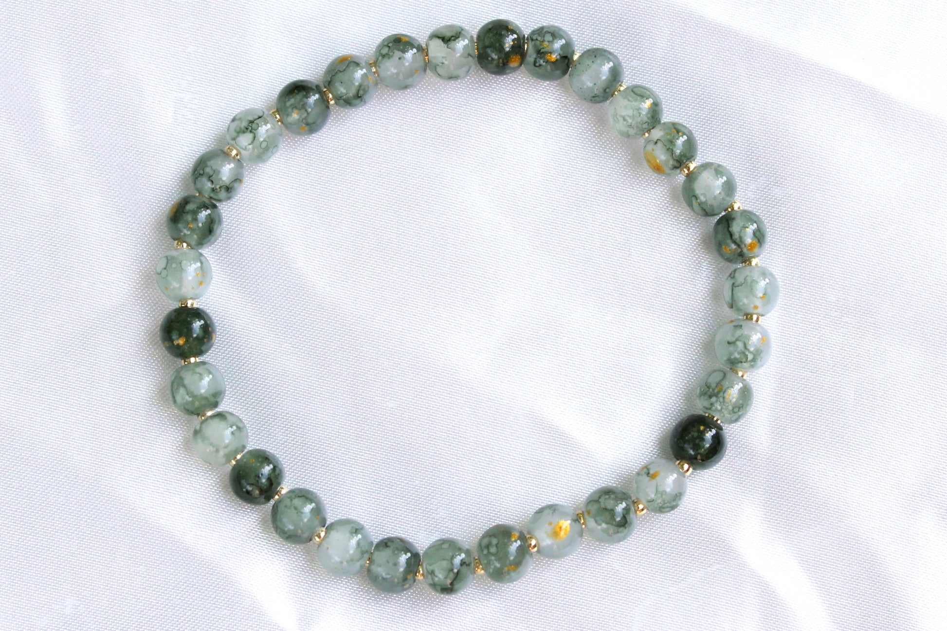For the guy who lives for fresh air and style that works anywhere — from trail hikes to coffee runs. This stretchy bracelet features subtle foresty greens with a drizzle of gold, crafted from 6mm glass beads separated by tiny gold spacers. It’s rugged, refined, and designed to fit like it was made just for him.