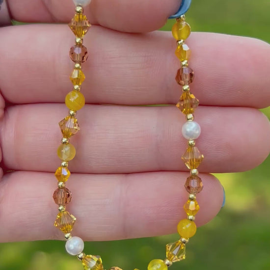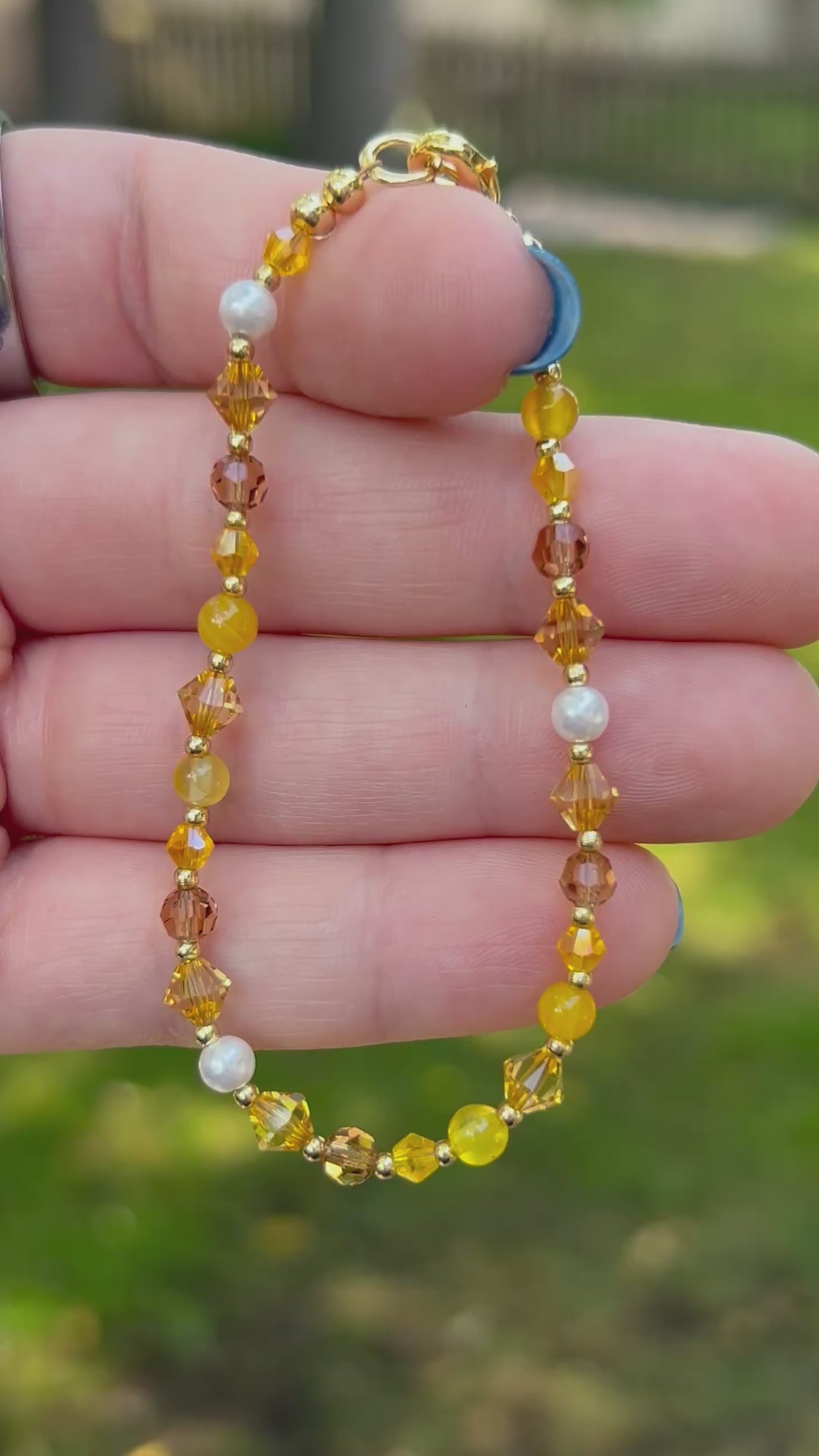 Citrine tones with darker yellow and brown accents, plus pearls, make this bracelet warm, sparkly, and fall-ready. 6.5” with a 0.5” extender layers easily with your other favorites—great for November birthdays or anyone who loves cozy autumn colors.