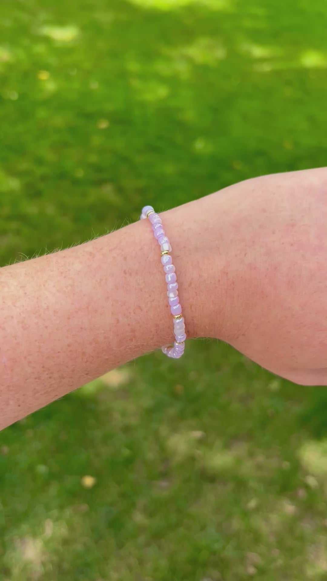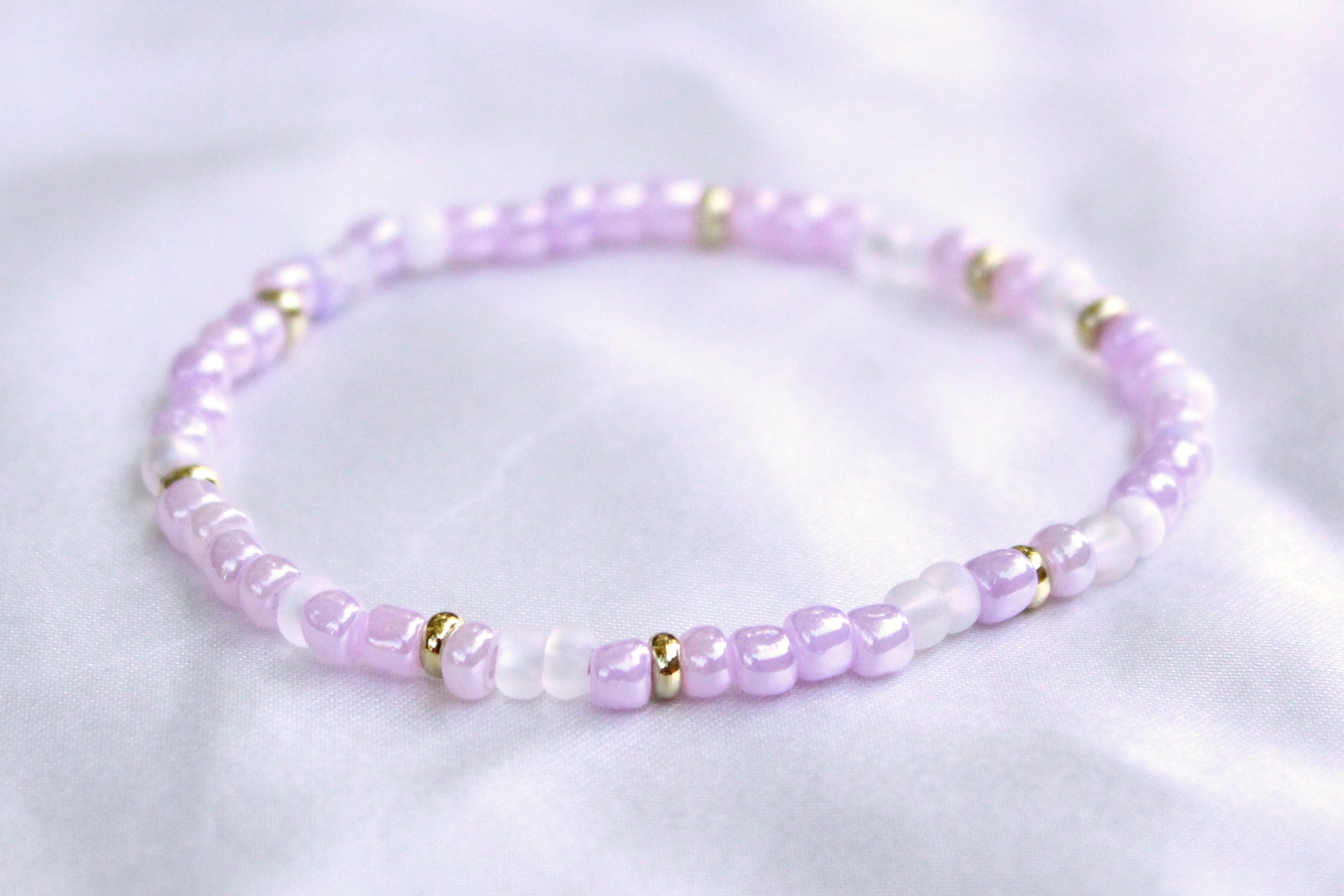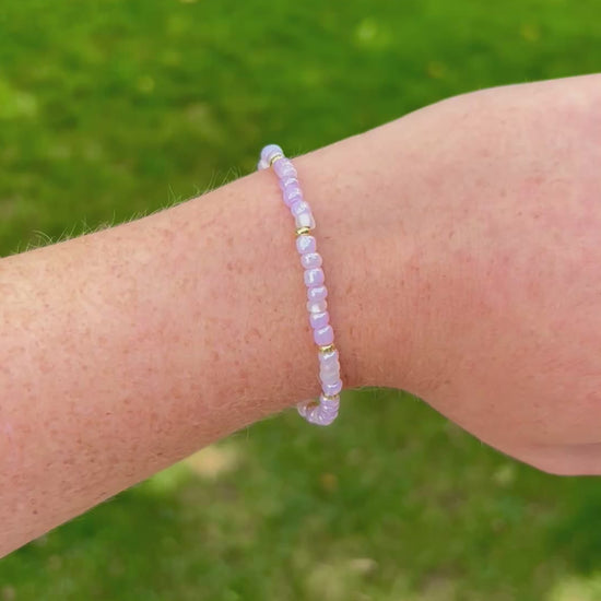 The Pink Petal Bracelet is delicate, floral, and stackable as heck. It features seed beads in a soft pink color scheme, strung on a comfy stretchy band that makes putting it on (and never taking it off) way too easy.
