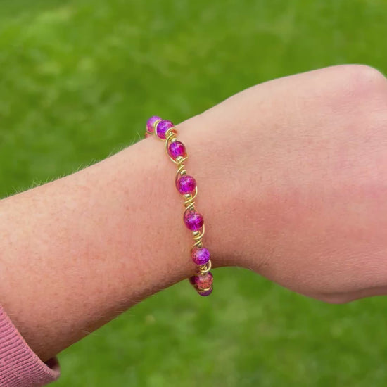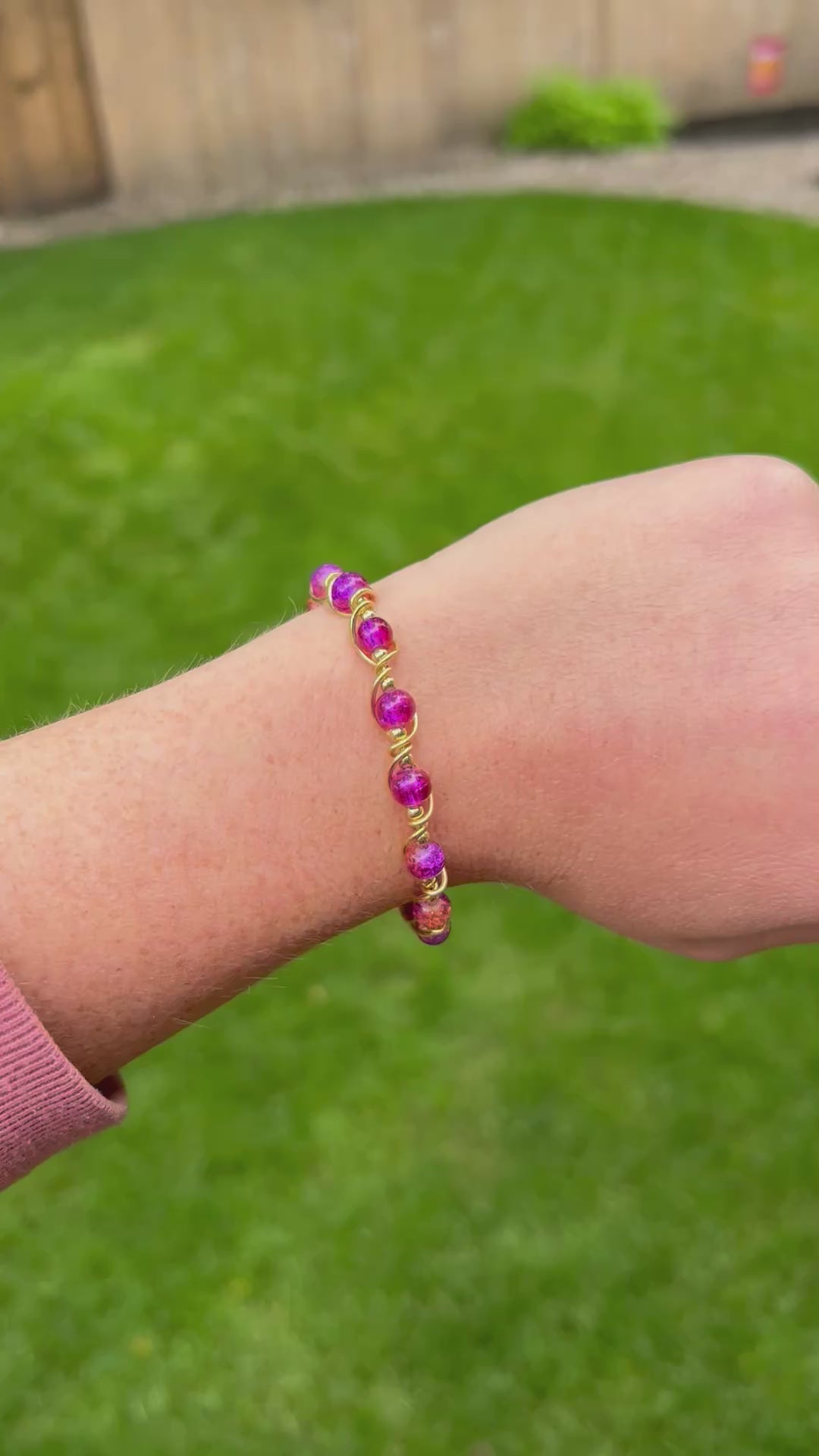 Bright, bold, and full of heart—Sarah’s Bracelet was designed to reflect the radiant, bubbly energy of someone truly unforgettable. Wrapped in glimmering gold wire, the wavy design links vibrant purple and orange beads in a joyful mix of color and movement. The purple is a soft nod to her Sigma Kappa roots, while the orange shines like the warmth she brought to everyone around her—reminiscent of her red hair and cozy autumn palette.