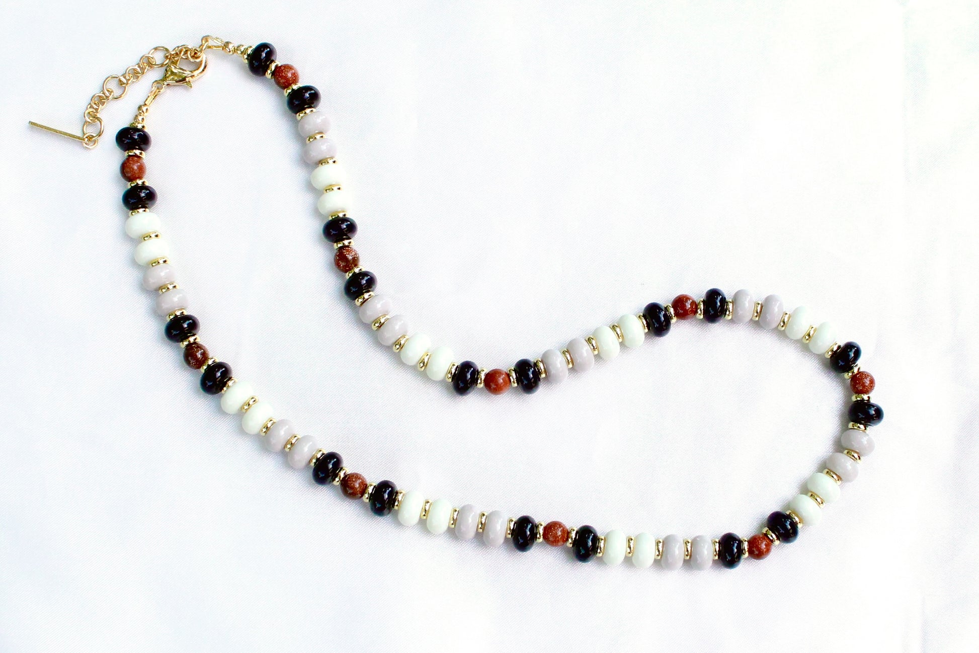 Handmade with a moody mix of black, white, light grey, and warm shimmer-brown beads, this pattern plays it cool while the gold accents bring the heat. Finished with a gold extender chain for an easy fit over any neckline.